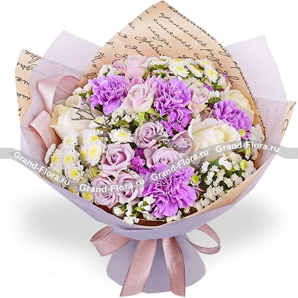 Люкс: роза белая - 3 шт., роза кустовая фиолетовая - 2 шт., гвоздика фиолетовая - 4 шт., хризантема сантини - 2 шт., хризантема кустовая ромашковая фиолетовая - 4 шт., статица, упаковка, лента. Примерный размер: 40Х40 см.