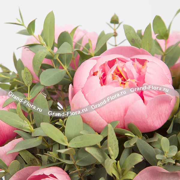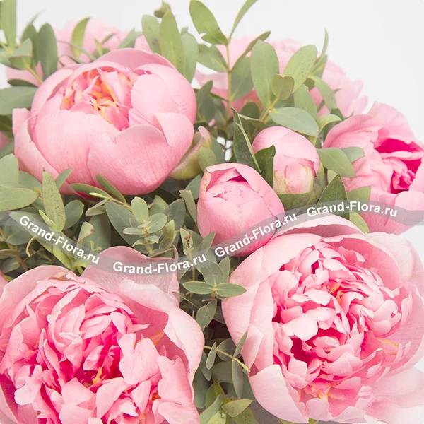 Стандартный: пион розовый - 15 шт., декоративная зелень, оазис, коробка.